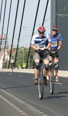 Kurz vor dem Ziel wurden wir gestoppt, damit wir keine Läufer behindern. Eigentlich war das nun eh nicht mehr nötig, weil bei dieser Zeit nur mehr ambitionierte Hobbyläufer unterwegs waren. Gut, wir warteten die zwei Minuten und fuhren gemeinsam zum Ziel. Auf der Zielgeraden, sprintete Nadine noch nach vorne, während Christoph, Kai und ich gemeinsam durchs Ziel fuhren.